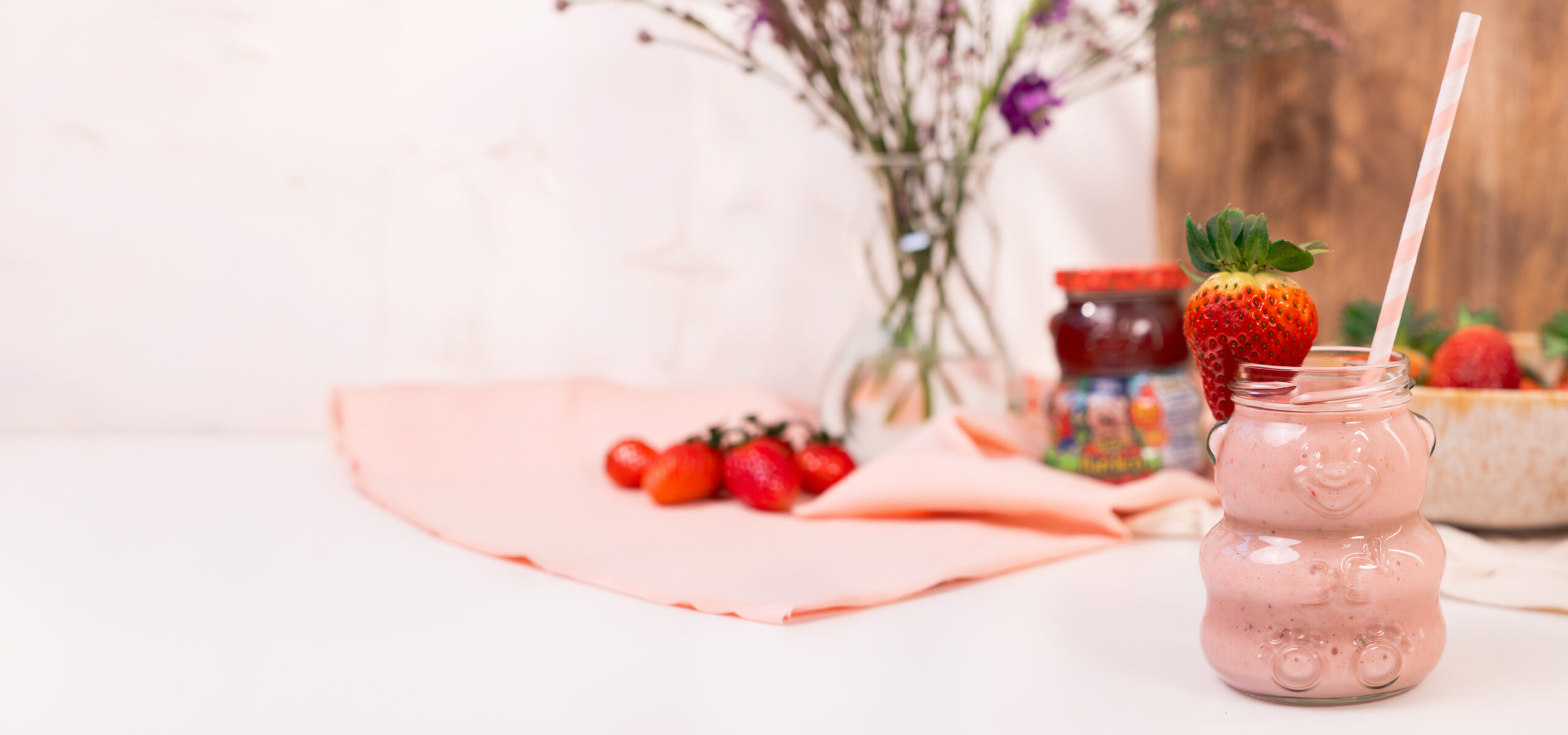 Den fertigen Smoothie mit einer Erdbeere garnieren und am besten im Bärchen-Glas servieren!